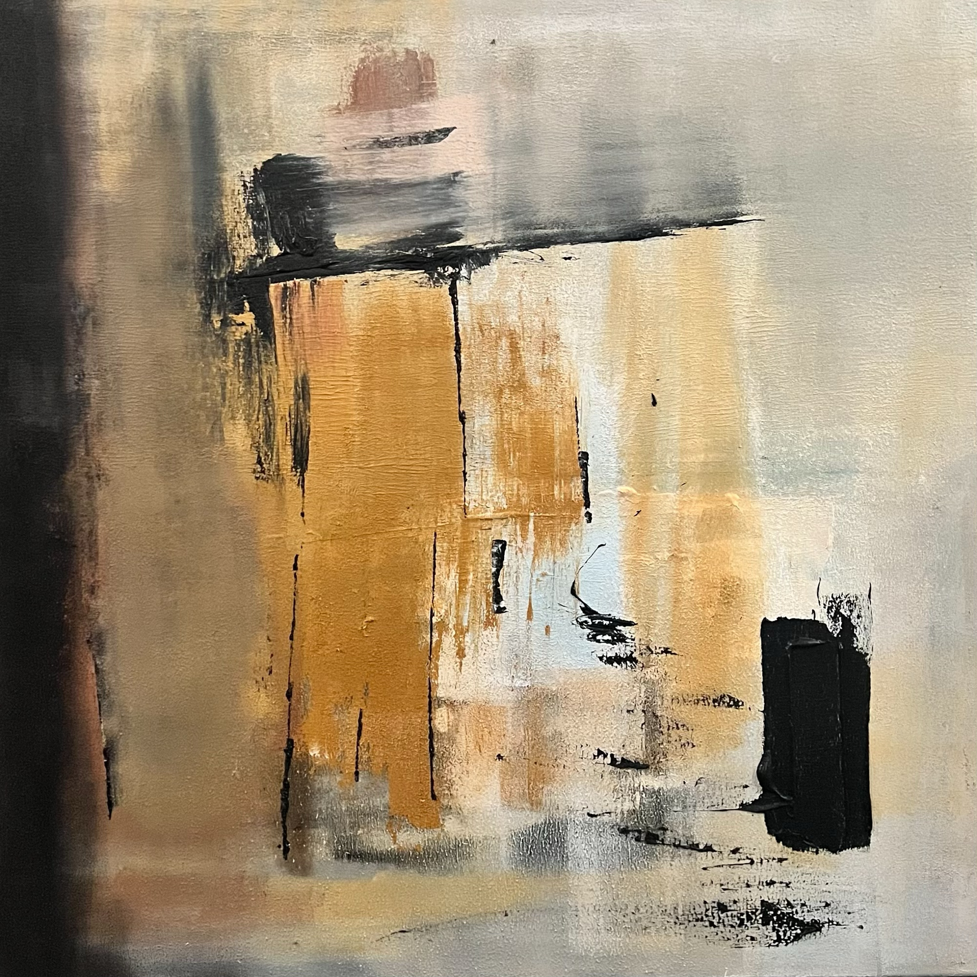 A 100 x 100 cm abstract work that explores the interplay between darkness and illumination. Rich tones of ochre, beige, and soft gray are layered with deep blacks and subtle whites, creating tension and harmony within the composition. Textural brushwork and gentle transitions evoke a sense of movement and depth, symbolizing the balance between concealment and revelation.